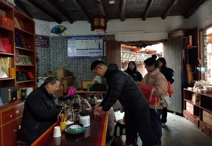 服务就是生产力。调研中,古镇商户热情招揽游客进店品茗,介绍道:“我们这里春节期间每天都是人挤人,你们看那边的龙灯、文创产品都很有趣。” 通过此次调研,调研队成员充分感受到羊楼洞古镇再度展现“世界茶叶贸易第一古镇”的无限活力。借此契机,调研队更是积极讨论、思考如何将学校优势资源及所学专业运用到推进羊楼洞茶产业与旅游业融合的过程中,结合团队创新创业计划,进一步践行产学研相贯通,为当地乡村振兴服务,创造良好的社会、经济、生态和文化效益,为当地茶旅产业助推乡村全面振兴迈向新赛道、新阶段贡献力量。