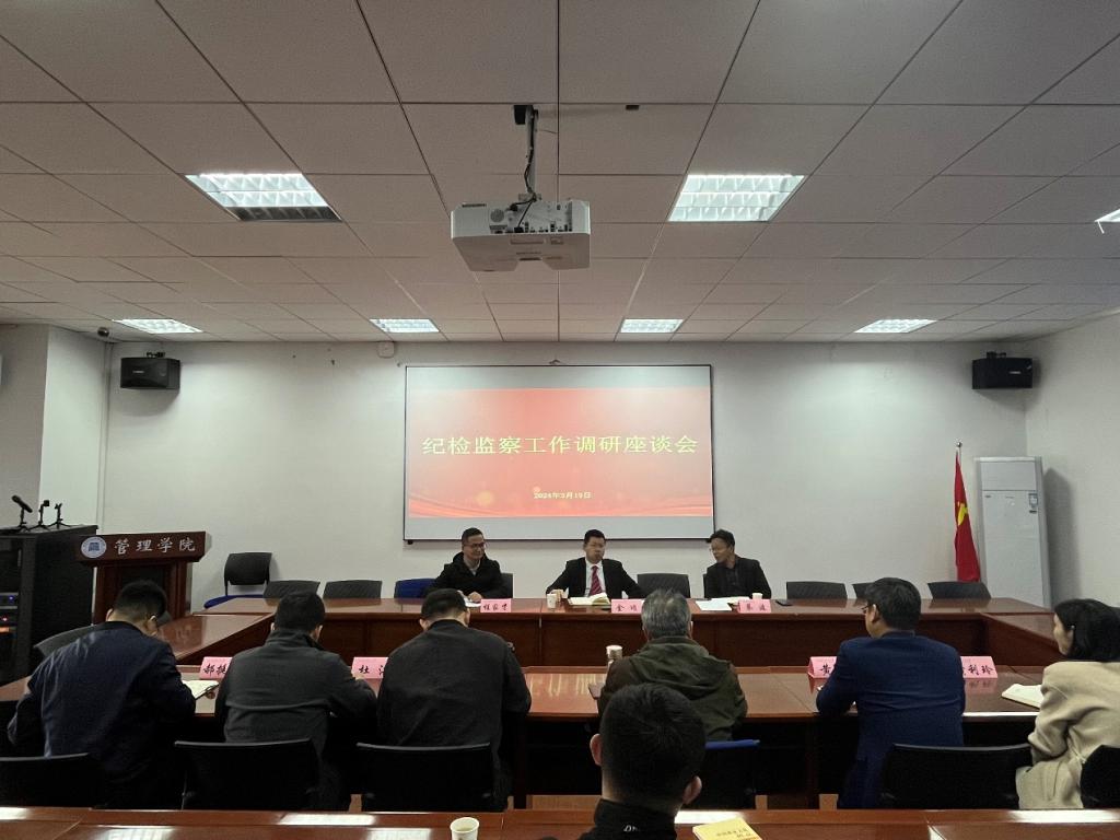 3月19日上午,校党委常委、纪委书记、省监委驻校监察专员、二级高级监察官金颂到yl7703永利官网调研校党委二届六次全会、教代会、校纪委二届七次全会学习宣传情况,学院党委履行全面从严治党主体责任情况,纪检委员履职情况,粮廉文化课题研究进展情况。校纪委、监察专员办公室相关人员陪同调研。yl7703永利官网在家全体领导班子和教师代表参加座谈。